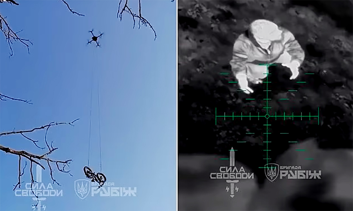 Украины Үндэсний гвардийн “Рубеж” бригадынхан 39 кг жинтэй цахилгаан дугуйг бөмбөгдөгч зөөвөрлөдөг хүнд даацын жижиг дроноор шархадсан цэрэгт хүргэсэн байна.