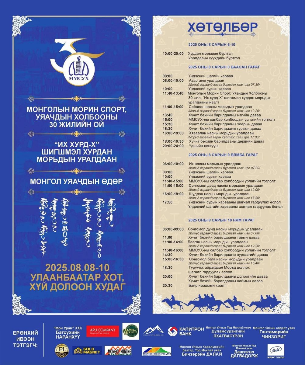 Монголын Морин спорт, уяачдын холбоог үүсгэн байгуулсны 30 жилийн ой, шигшмэл хурдан хүлгүүдийн энэхүү уралдаан Монгол уяачдын баяр наадам болох юм.