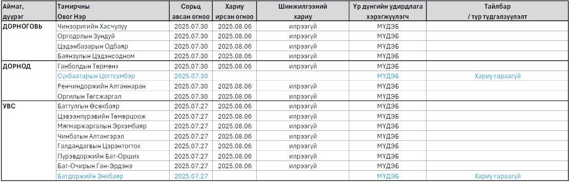 Гурван аймгаас авсан нийт 16 сорьцын 14-ийнх нь шинжилгээний хариу ирсэн бөгөөд үлдсэн хоёр сорьцын хариу одоогоор бүрэн гараагүй байна гэж Монголын Үндэсний допингийн эсрэг байгууллагаас өчигдөр (2025.08.07) танилцууллаа.