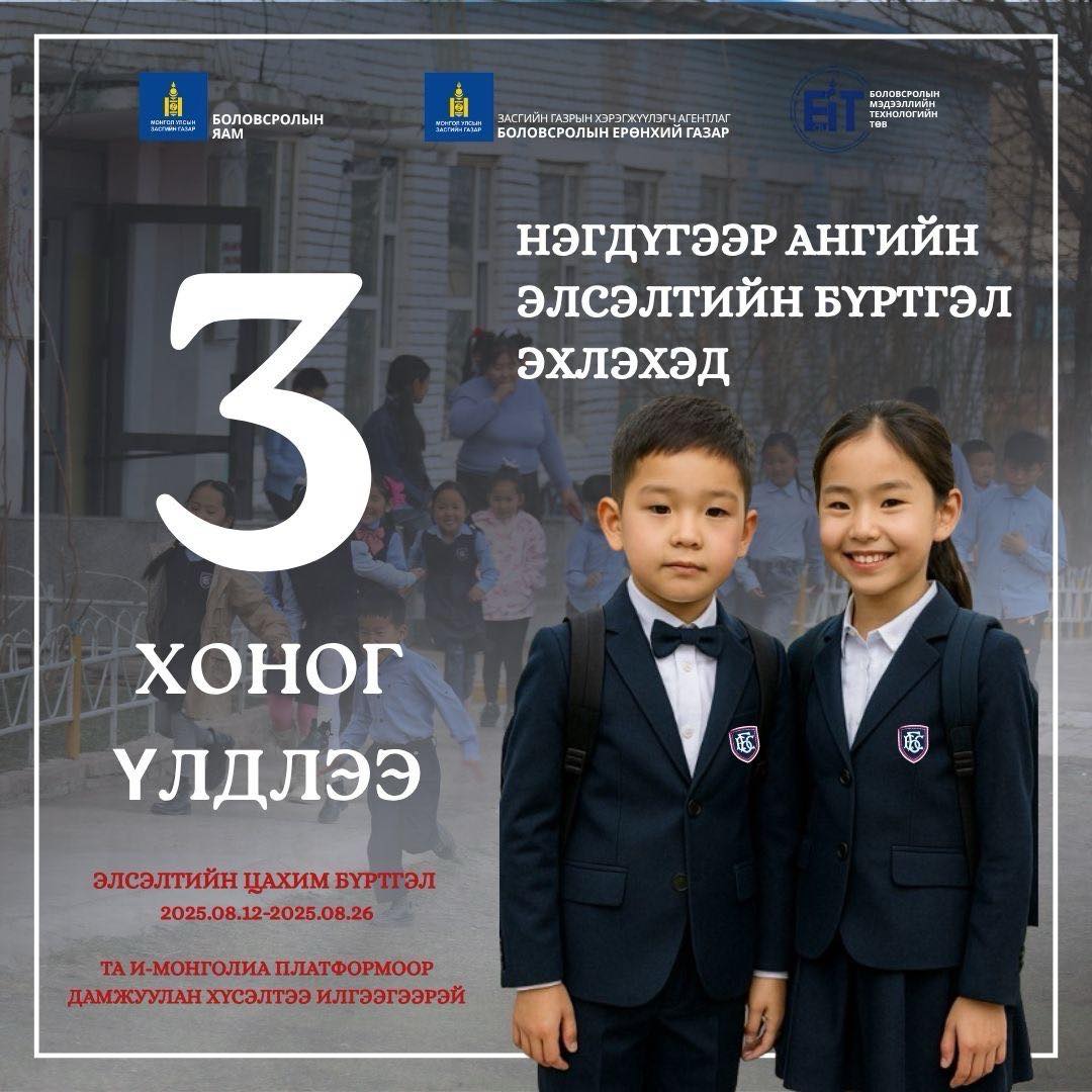 2025-2026 оны хичээлийн жилд Төрийн өмчийн ерөнхий боловсролын сургуулийн 1 дүгээр ангийн элсэлтийн цахим бүртгэлийг улсын хэмжээнд 2025 оны 08 дугаар сарын 12-ны өдрөөс 08 дугаар сарын 26-ны өдрийг дуустал E-Mongolia системээр дамжуулан зохион байгуулна.