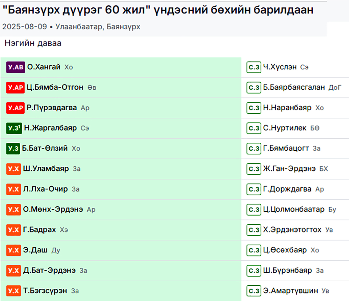 Ийнхүү хоёр ойд зэрэг барилдаж бөхчүүдээс хоёуланд нь зэрэг түрүүлчих ч боломж бий. Үүгээрээ энэ хоёр барилдаан онцгой сонирхол татаж байна. Гэхдээ О.Хангай аварга Баянзүрх дүүргийн ойн барилдааны дөрвийн даваанд аймгийн начин Б.Гончигсүрэнд унасан бол улсын арслан Ц.Бямба-Отгон мөн даваанд аймгийн арслан Д.Алтанцоожид өвдөг шороодлоо.