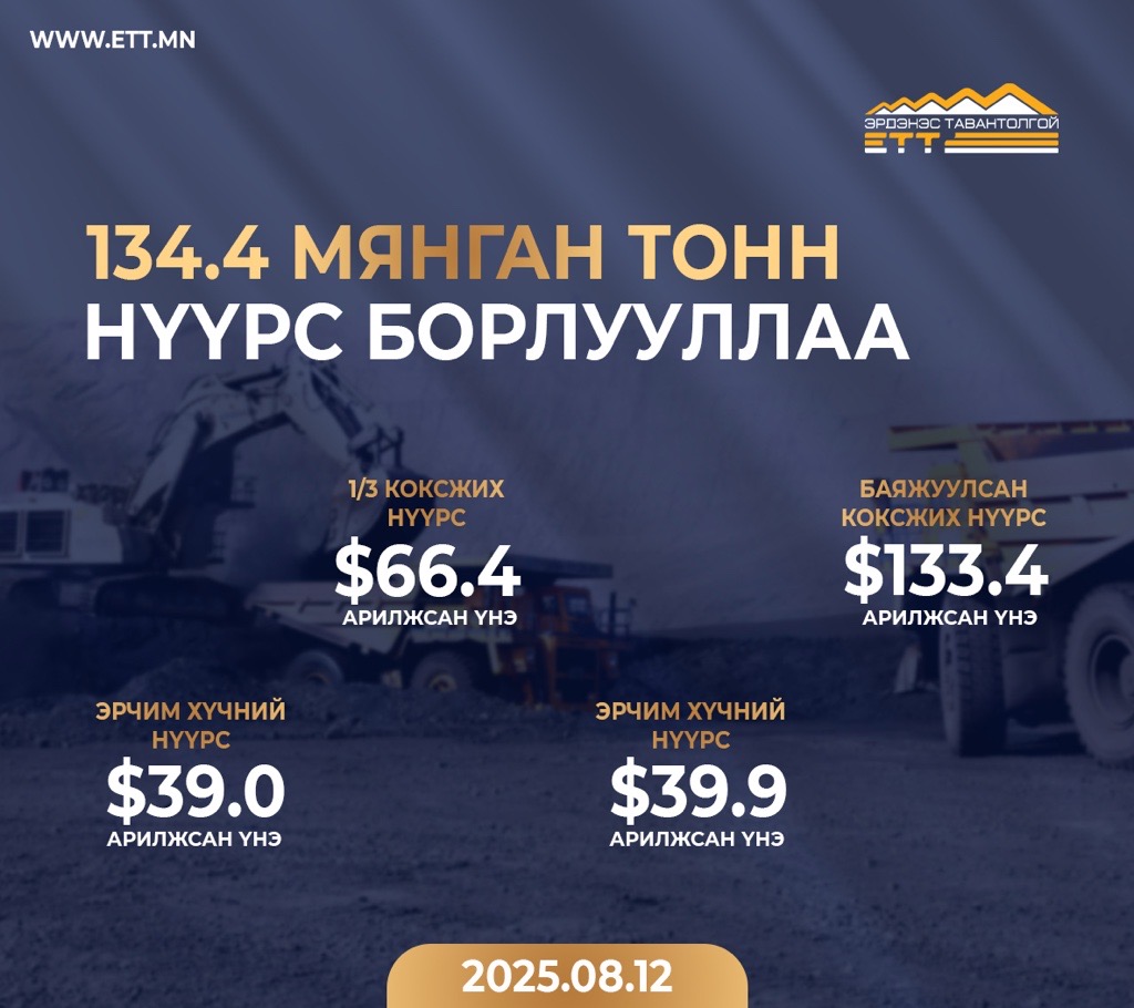 "Эрдэнэс Тавантолгой" ХК 2025 оны наймдугаар сарын 12-ны өдөр Монголын Хөрөнгийн биржээр дамжуулан дөрвөн удаагийн арилжаагаар 19.2 мянган тонн баяжуулсан коксжих нүүрс, 64.0 мянган тонн 1/3 коксжих нүүрс, 51.2 мянган тонн эрчим хүчний нүүрс, нийт 134.4 мянган тонн нүүрс БНХАУ-ын Ганцмод боомт хүргэж өгөх нөхцөлөөр амжилттай арилжааллаа.
