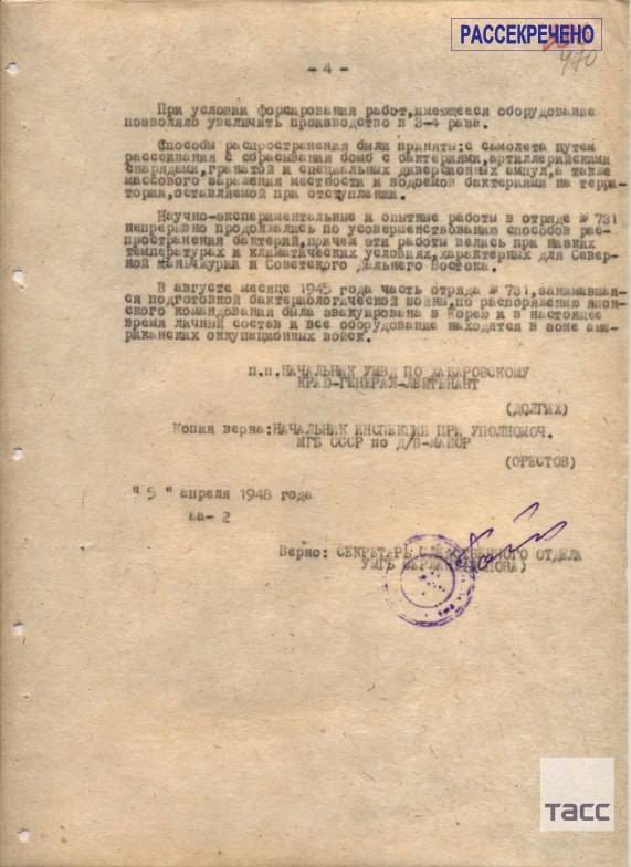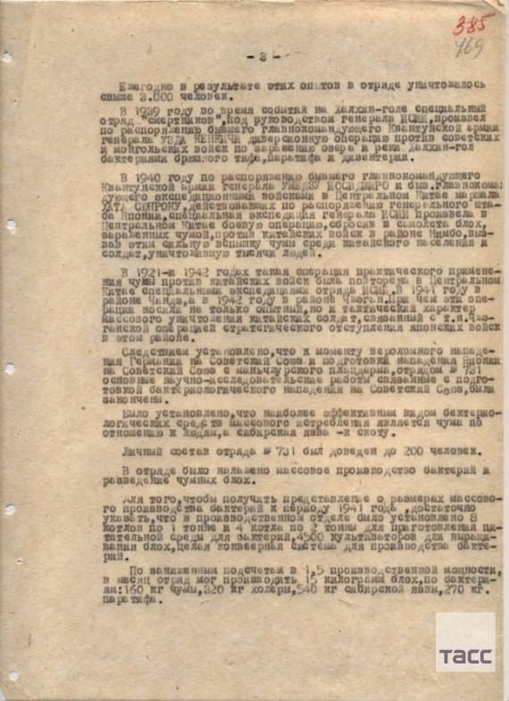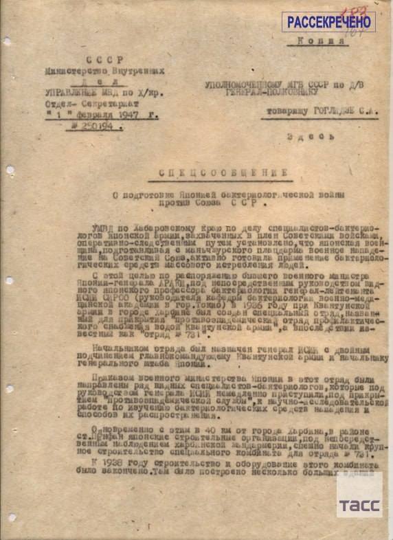 "Зөвлөлтийн цэргүүдэд олзлогдсон Японы армийн бактериологич мэргэжилтнүүдийн хэрэгтэй холбогдуулан Хабаровскийн хязгаарын Дотоод явдлын удирдах газар Японы цэргийн дарангуйлагчид Манжуур дахь түшиц газраа ашиглан Зөвлөлт Холбоот Улс руу халдан довтлоход зэхэж хүн амыг үй олноор устгах бактериологийн зэвсэг хэрэглэхэд идэвхтэй бэлтгэж байсныг шуурхай мөрдөн байцаалтаар тогтоосон байна. Тэд тахал, цусан халдвар (сибирийн язва), хийт гангрена, хижиг халууралт, гэдэсний хижиг, паратиф, цусан суулга, холера, халдварт цус алдалт (“Сонго” гэж нэрлэгддэг), сап зэрэг бүх төрлийн халдварт өвчнөөр шинжилгээ судалгаа, туршилтын ажил хийж байв. Бактерийн янз бүрийн нөлөөллийг шалгахын тулд хүн дээр байнгын туршилт хийж байсан бөгөөд үүний тулд отрядын шоронд орос, хятад, манжууд, мөн цаазын ял авсан япончуудыг маш нууц байдлаар авчран хорьж байжээ" хэмээн ЗХУ-ын ДЯЯ-ны Хабаровск мужийг хамаардаг газрын дарга, дэслэгч генерал Иван Долгих 1947 оны 2 дугаар сарын 1-ний өдрийн тусгай мэдээндээ дурдсан байна.
