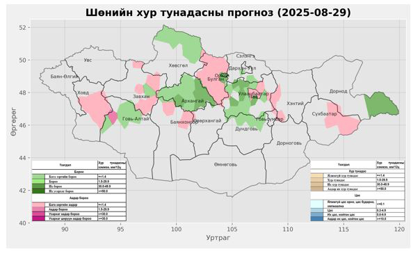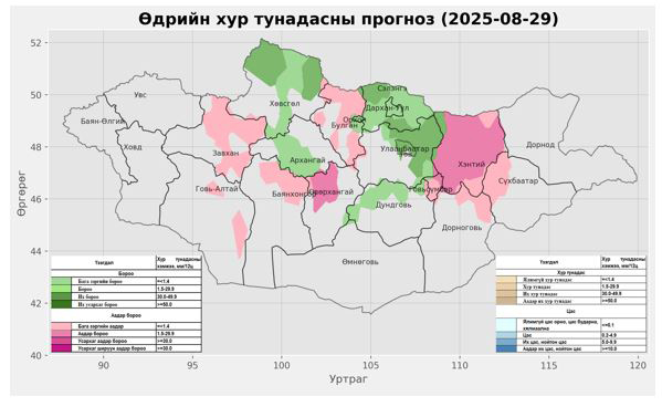 Өнөө шөнө /2025.08.28-29/ Хөвсгөл, Булганы хойд хэсгээр, 29-нд Өвөрхангайн хойд хэсэг, Төв, Сэлэнгэ, Хэнтийн нутгаар бороо, дуу цахилгаантай аадар бороо орох тул болзошгүй мөндөр, аянга цахилгаан, үерийн аюулаас сэрэмжтэй байхыг анхааруулж байна.