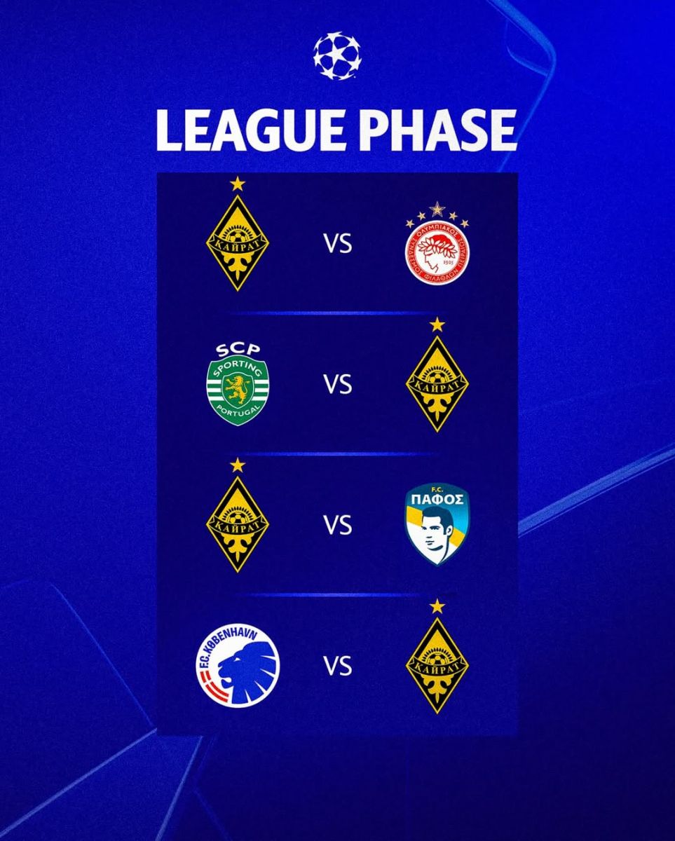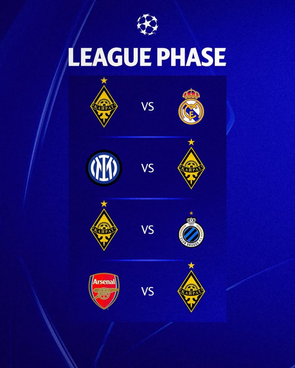 “Кайрат” сугалаагаар Испанийн “Реал Мадрид”-тай гэртээ тоглохоор болж, фанатуудынхаа магнайг тэнийлгэснээс гадна Бельгийн “Брюгге”, Грекийн “Олимпиакос”, Киприйн “Пафос”-той талбайдаа тоглох юм. Харин Италийн “Интер”, Английн “Арсенал”, Португалын “Спортинг”, Данийн “Копенгаген”-тай зочлон тоглоно.