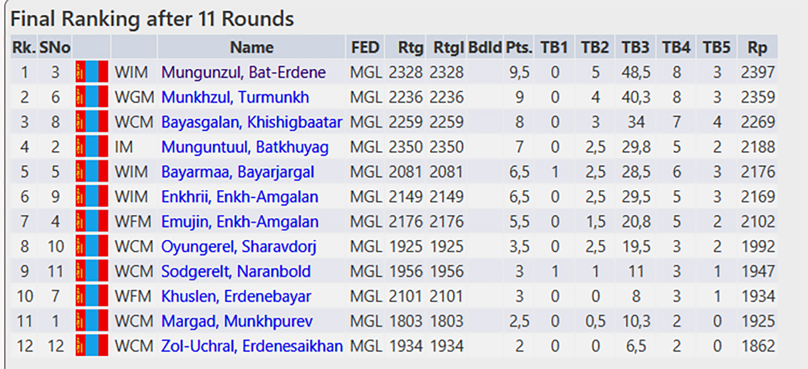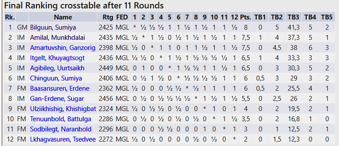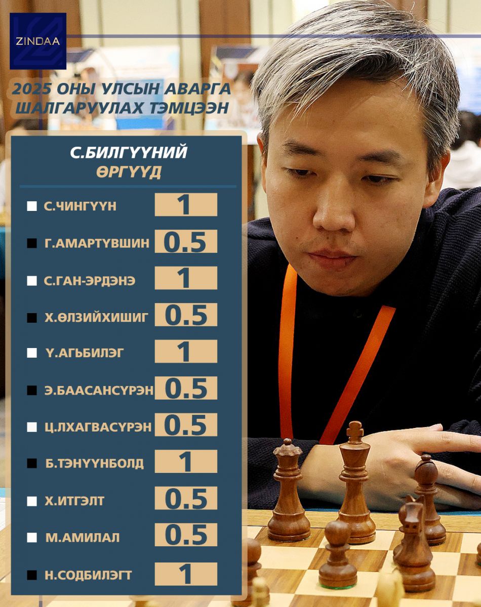 Тэгвэл өнөөдөр буюу сүүлчийн өрөгт их мастер Сумъяагийн Билгүүн өрсөлдөгч Н.Содбилэгтийг хожсоноор 8 оноотой болж, улсын аваргаар тодорлоо. Сүүлчийн өрөгт С.Билгүүнтэй ижил 7 оноотой явсан М.Амилал өрсөлдөгч Х.Итгэлттэй тэнцсэнээр оноо хувааж, 7.5 оноогоор аман хүзүүдлээ.