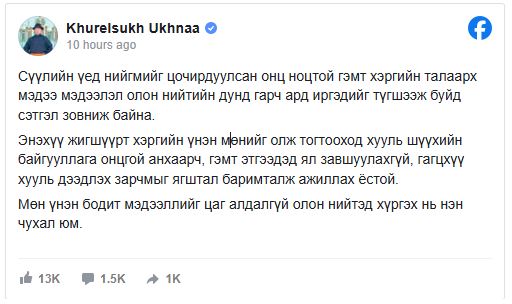 Сүүлийн хэдэн өдөр нийгмийн сүлжээнд онц ноцтой хүн амины хэргийн талаар сэтгэл хирдгийлгэм мэдээллүүд түгээж байна. Үүнтэй холбоотойгоор Ерөнхийлөгч У.Хүрэлсүх цахим хуудаснаа дараах байр суурийг илэрхийллээ.