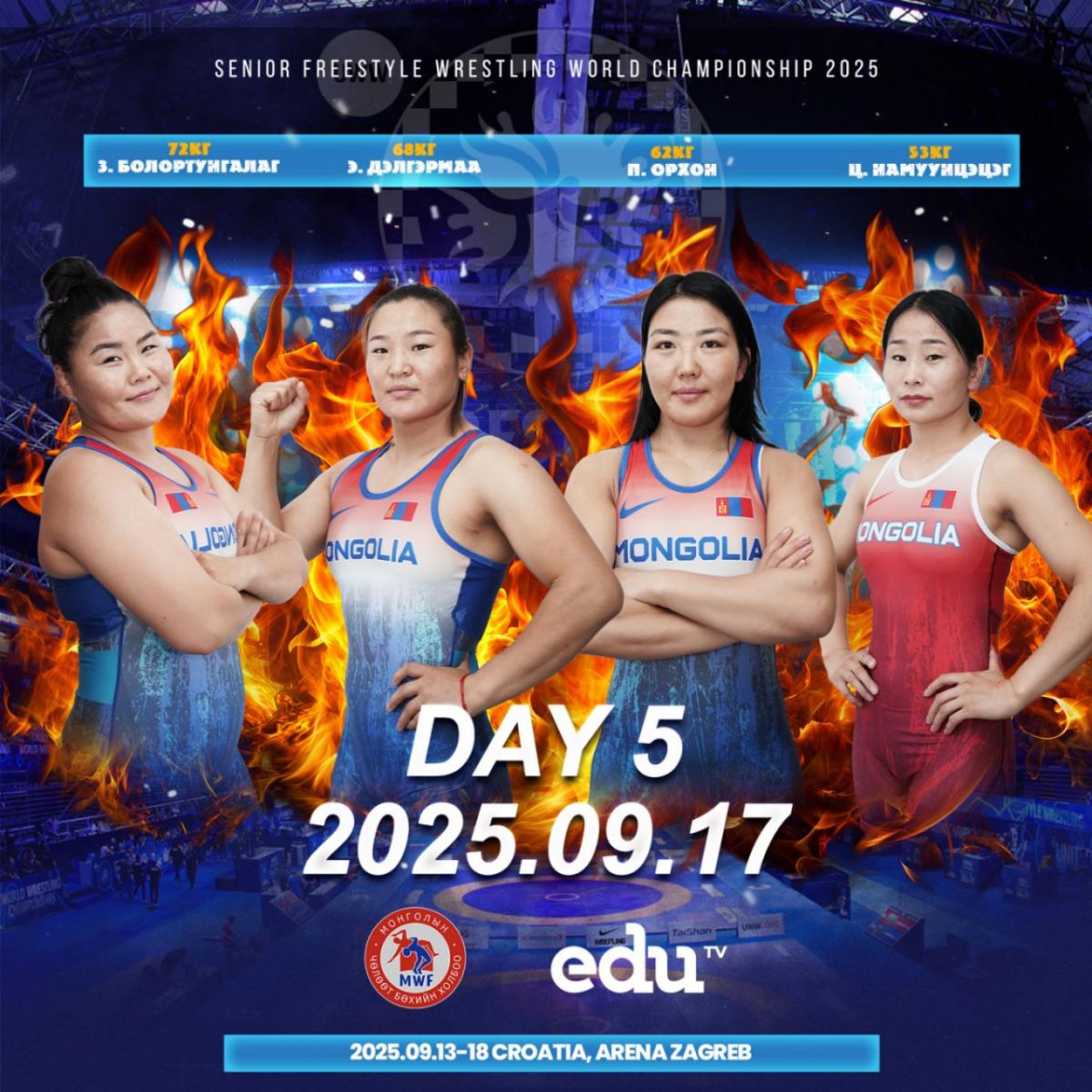 Хорватын Загреб хотноо явагдаж буй чөлөөт бөхийн ДАШТ-ий тав дахь өдөр эмэгтэйчүүдийн 53 кг-ын жинд Азийн АШТ-ий мөнгөн медальт Ц.Намуунцэцэг, 62 кг-д Дэлхийн аварга П.Орхон, 68 кг-д ДАШТ-ий мөнгөн медальт Э.Дэлгэрмаа, 72 кг-ын жинд Ази тивийн аварга З.Болортунгалаг нар хүч сорих болно.