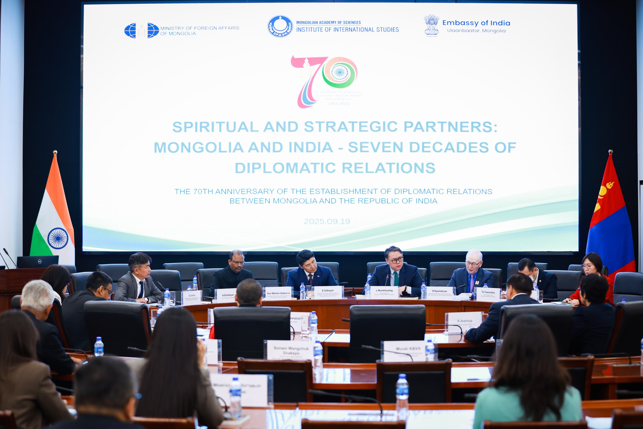 Монгол Улсын Гадаад харилцааны яам, Шинжлэх ухааны академийн Олон улс судлалын хүрээлэн, БНЭУ-аас Монгол Улсад суугаа Элчин сайдын яам хамтран Монгол, Энэтхэгийн дипломат харилцаа тогтоосны 70 жилийн ойн хүрээнд “Оюун санааны болон Стратегийн түншлэл: Монгол ба Энэтхэг – Дипломат харилцааны 70 жил” сэдэвт эрдэм шинжилгээний хурлыг 2025 оны 09 дүгээр сарын 19-ний өдөр Гадаад харилцааны яаманд зохион байгууллаа.
