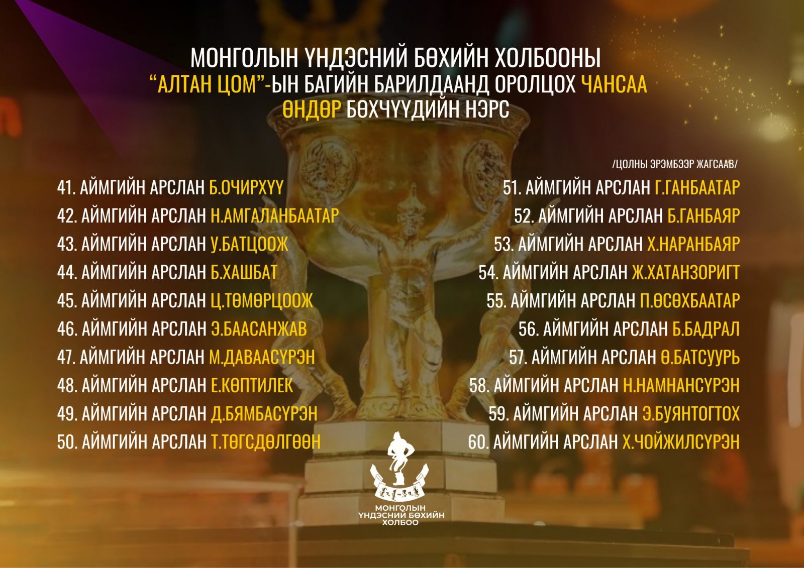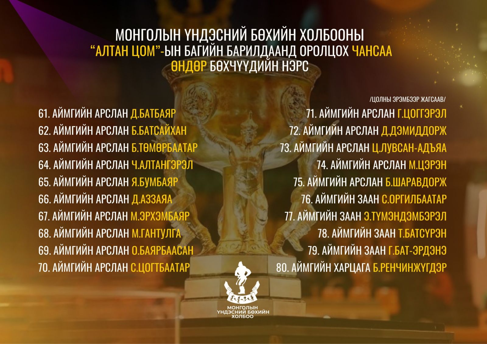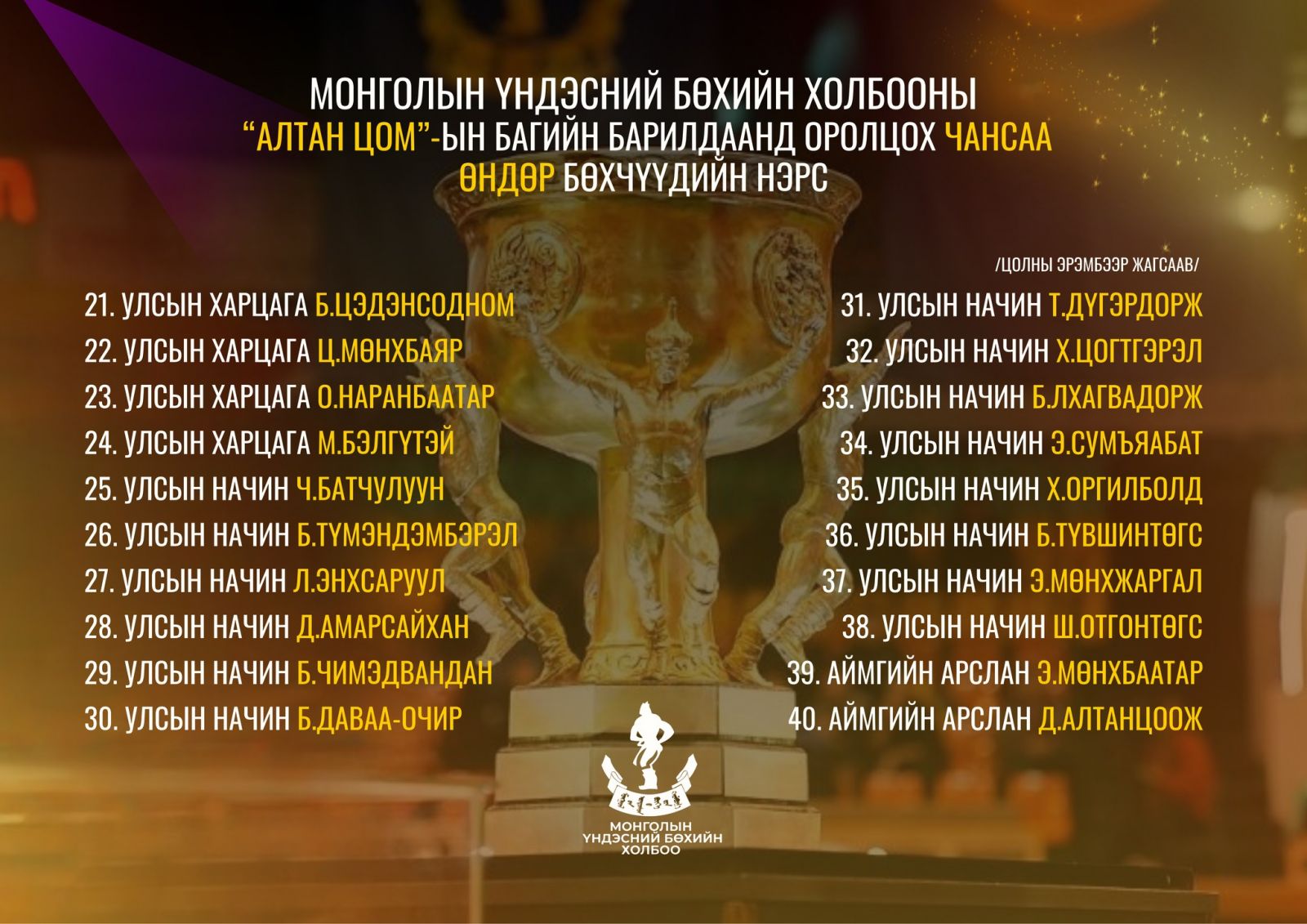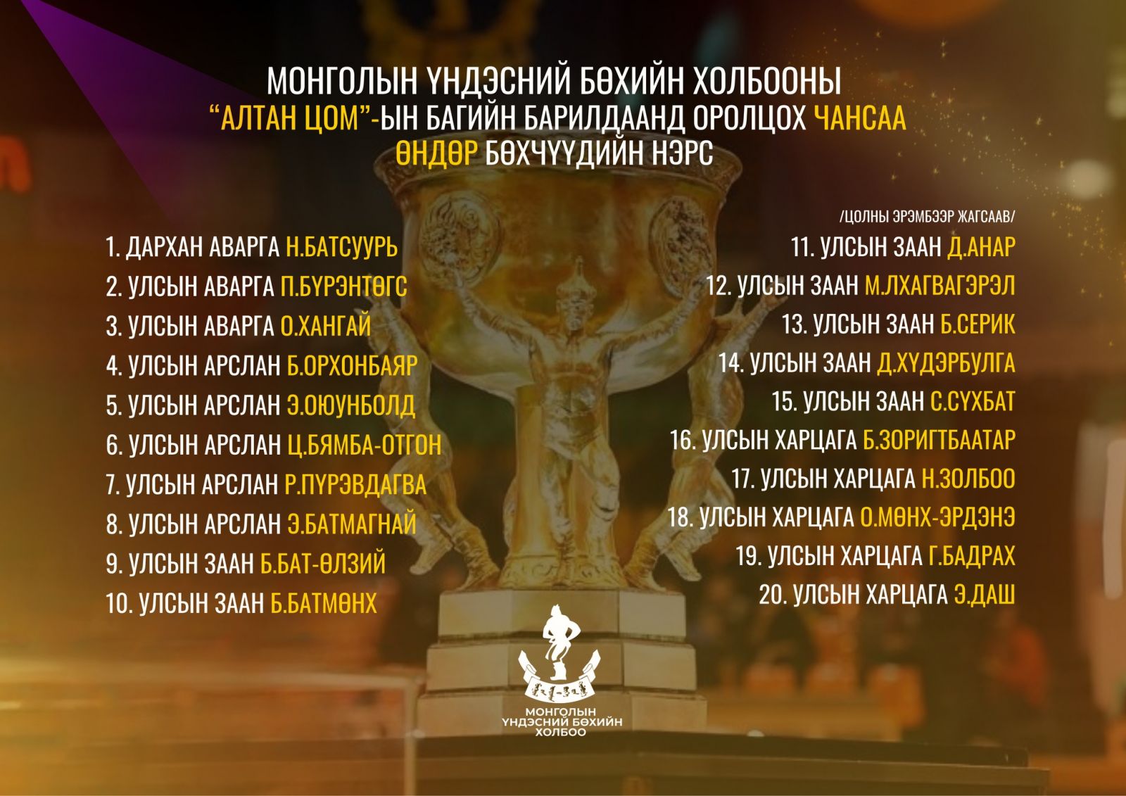 Харин “Алтан цом”-д оролцох боломжтой бөхчүүдийн энэхүү жагсаалтад өнгөрсөн долоодугаар сарын 29-30-нд Дорноговь аймгийн наадамд зодоглож, зарим сошиал хуудас болон бөхийн хорхойтнуудаас “цөлийн шуурга” гэх ёгт нэршил авсан улсын цолтой хэсэг бүлэг бөхчүүдийн нэрс багтжээ.