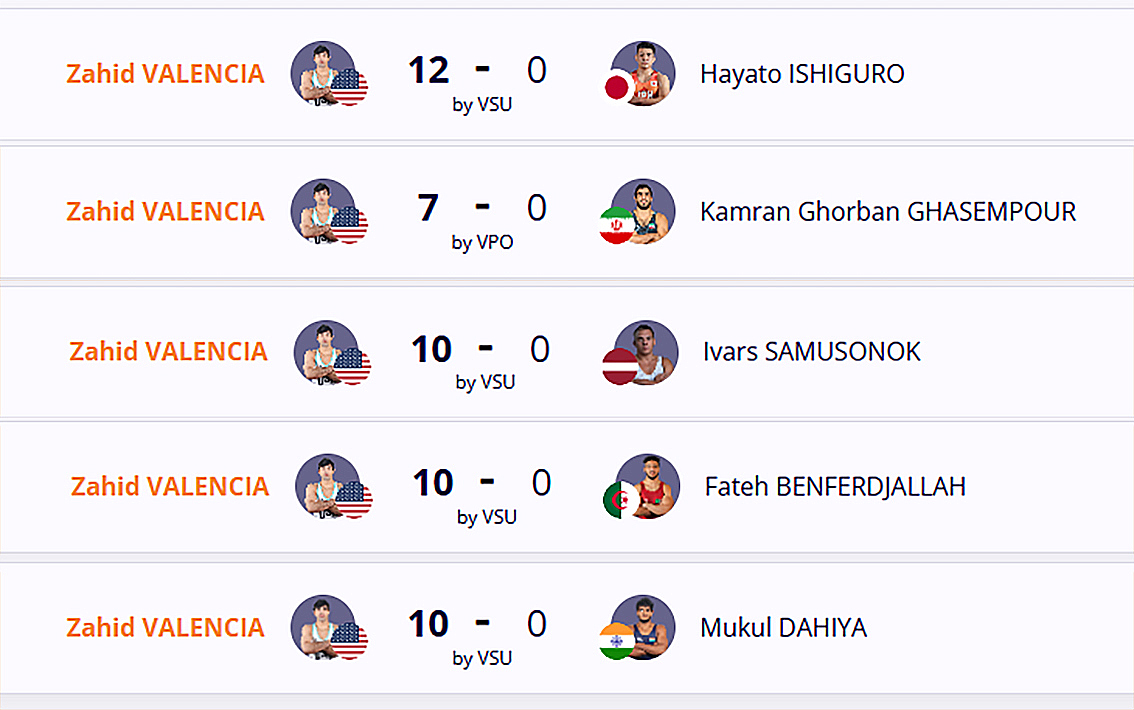 Мексик гаралтай Захид Валенсиа одоо 28 настай. Өдий хүртэл Дэлхийгээс нэг л хүрэл медаль хүртсэн. Өмнө нь АНУ-ын шигшээ багийн бүрэлдэхүүнд багтаж Олимп, Дэлхийн АШТ-д оролцсон нь бараг үгүй. 2023 онд ДАШТ-ий 92 кг-ын жинд барилдаж, хүрэл медаль хүртсэнээс өөрөөр том тэмцээнээс медальгүй.