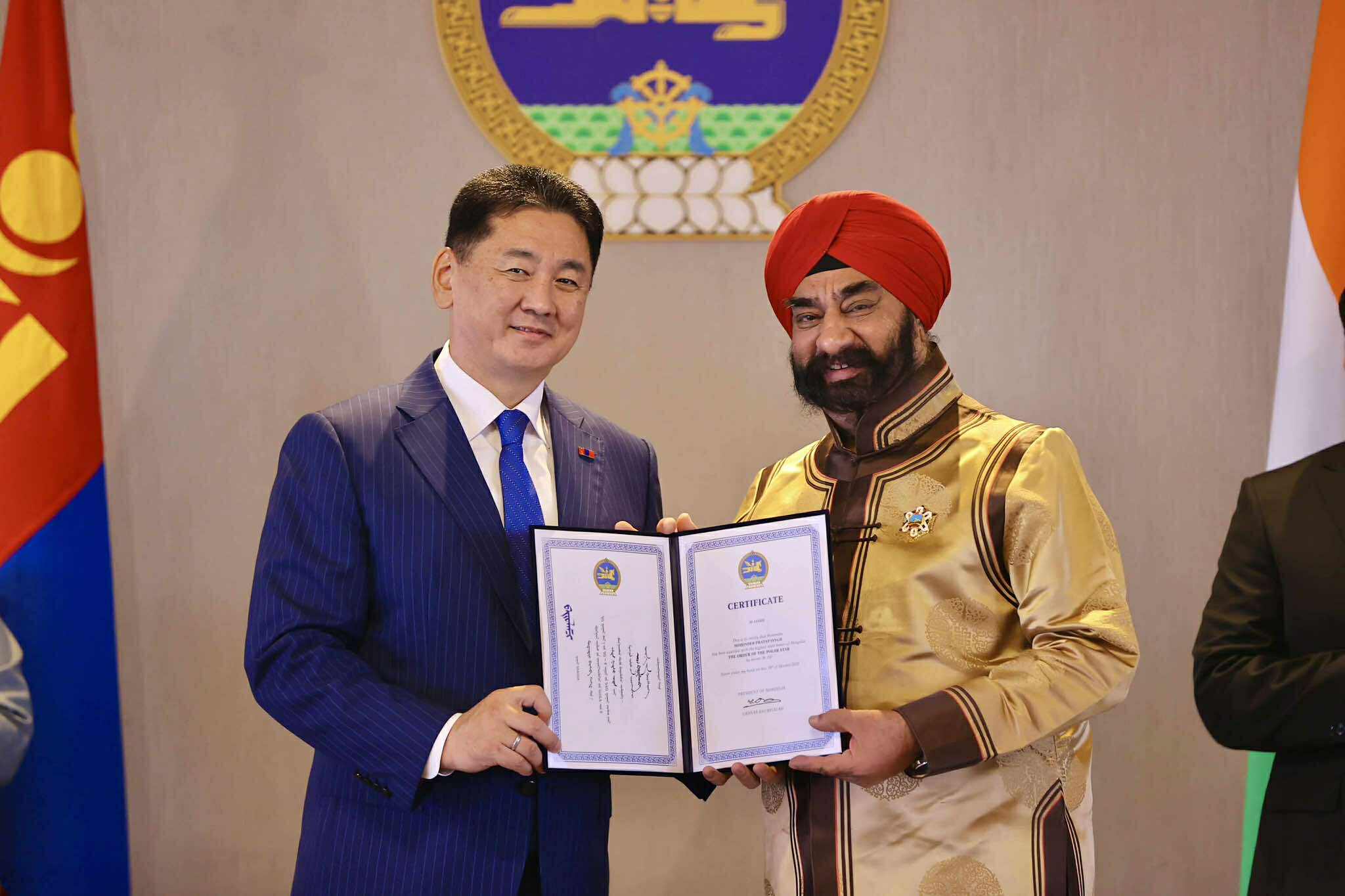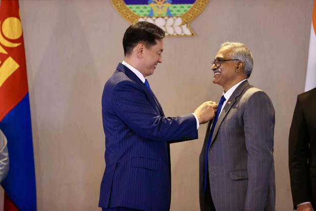 Хоёр орны хооронд дипломат харилцаа тогтоосны 70 жилийн ойг тохиолдуулан харилцаа, хамтын ажиллагааг өргөжүүлэн хөгжүүлэхэд үнэтэй хувь нэмэр оруулсан энэтхэг иргэдийг төрийн одон, медалиар шагналаа.