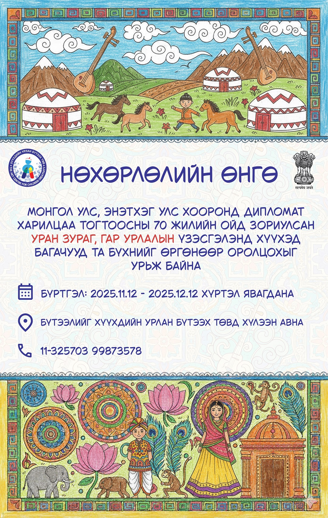 Монгол Улс, Бүгд Найрамдах Энэтхэг Улсын хооронд дипломат харилцаа тогтоосны 70 жилийн ой тохиож буй. Энэ хүрээнд БНЭУ-аас Монгол Улсад суугаа ЭСЯ, Монголын Хүүхдийн урлан бүтээх төв хамтран “Нөхөрлөлийн Өнгө" уран зураг, гар урлал бүтээлийн үзэсгэлэн, уралдааныг хүүхэд багачуудын дунд зохион байгуулж байна.