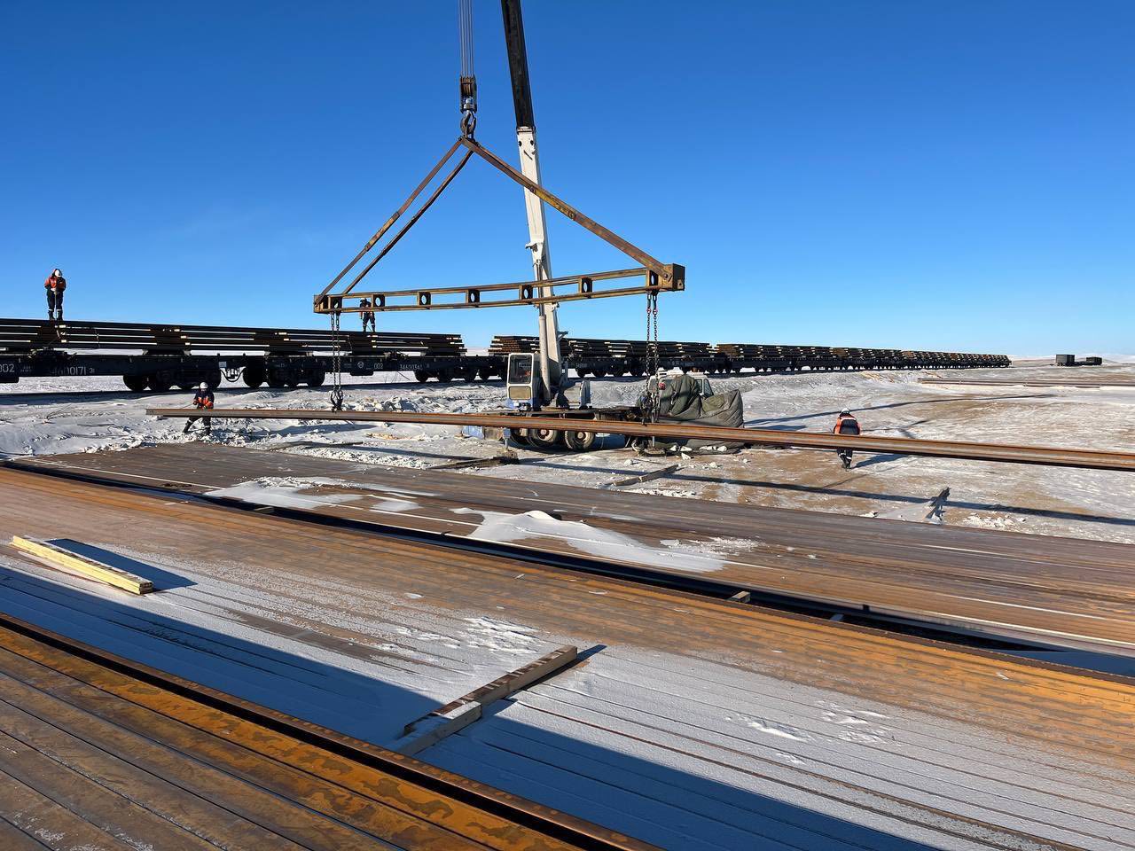 Тус төмөр замын төслийн дээд бүтцийн ажилд ашиглагдах материалын тээвэрлэлт, тэдгээрийг хүлээн авах болон талбайд тараан байршуулах ажлыг улирлын нөхцөл байдлаас үл хамааран тасралтгүй үргэлжүүлж байна.