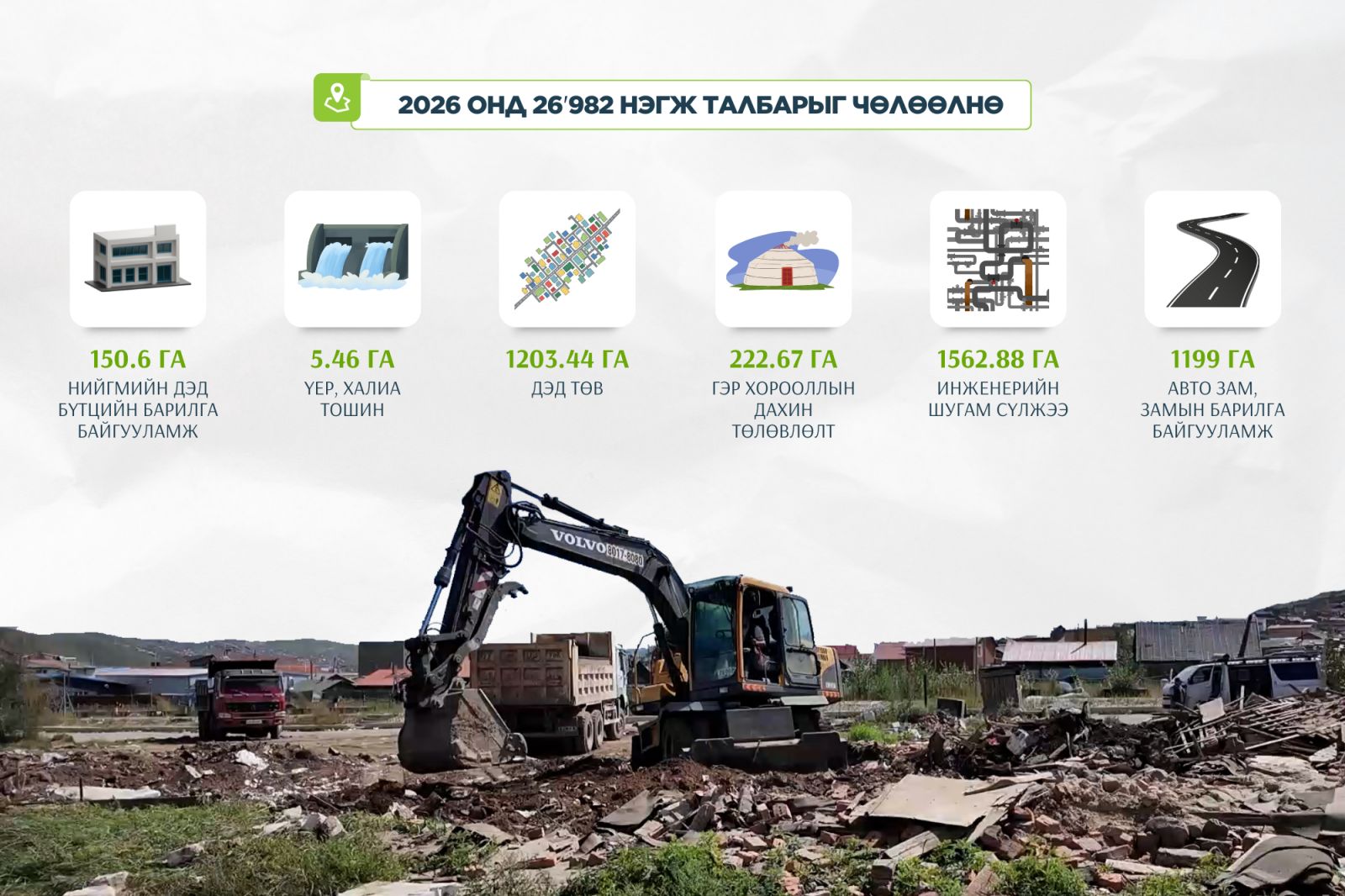 Тус ажлын хүрээнд энэ онд 3933 нэгж талбар чөлөөлөөд байгаа юм. Эдгээрээс инженерийн дэд бүтцийн хүрээнд 1021 нэгж талбар, хэсэгчилсэн ерөнхий төлөвлөлтийн хүрээнд 2332 нэгж талбар, нийгмийн дэд бүтцийн ажлын хүрээнд 580 нэгж талбар чөлөөлжээ. Газар чөлөөлөлт үргэлжилж байна.