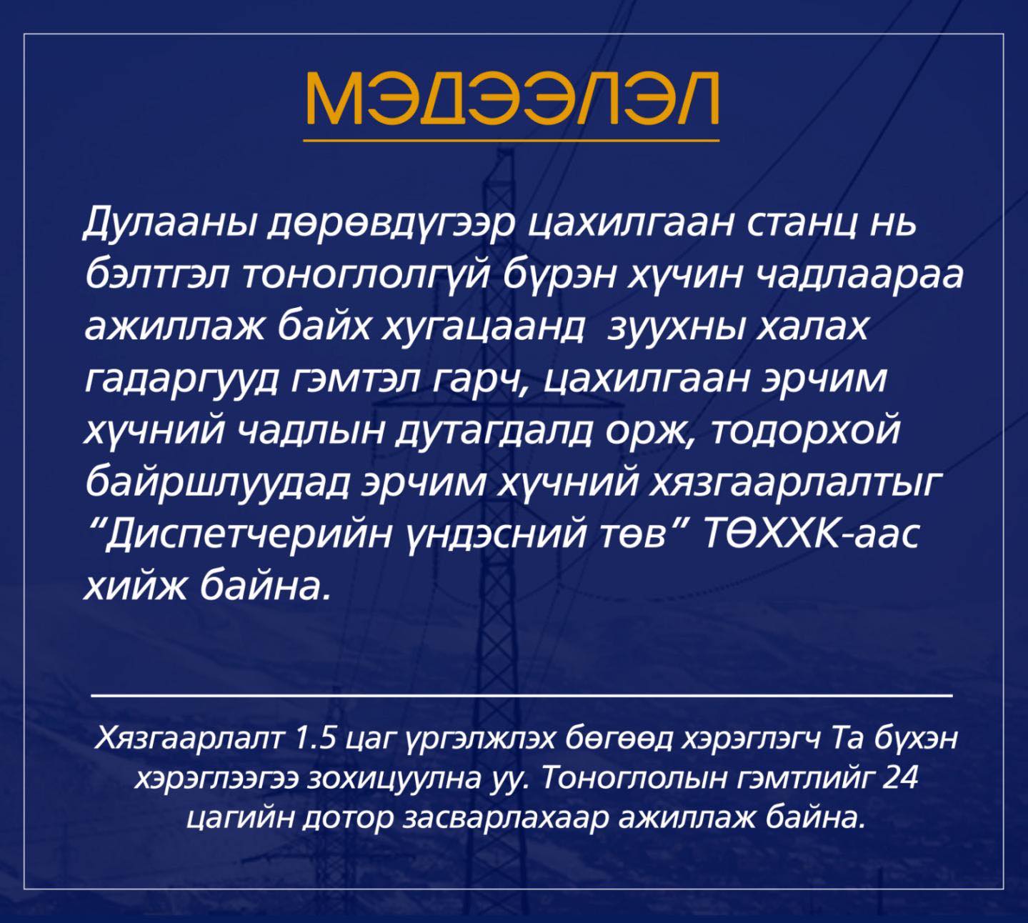 Хязгаарлалт 1.5 цаг үргэлжлэх бөгөөд хэрэглэгч Та бүхэн хэрэглээгээ зохицуулна уу. Тоноглолын гэмтлийг 24 цагийн дотор засварлахаар ажиллаж байна.