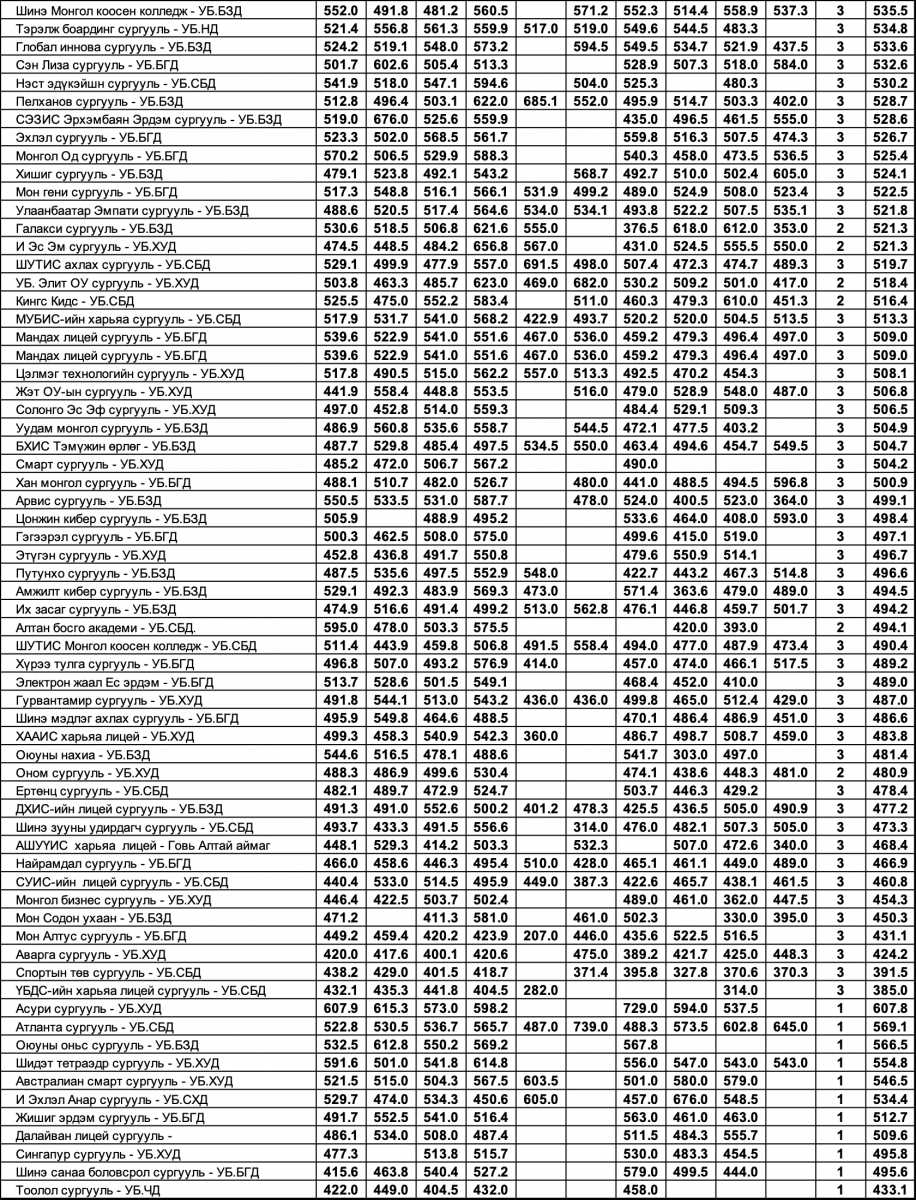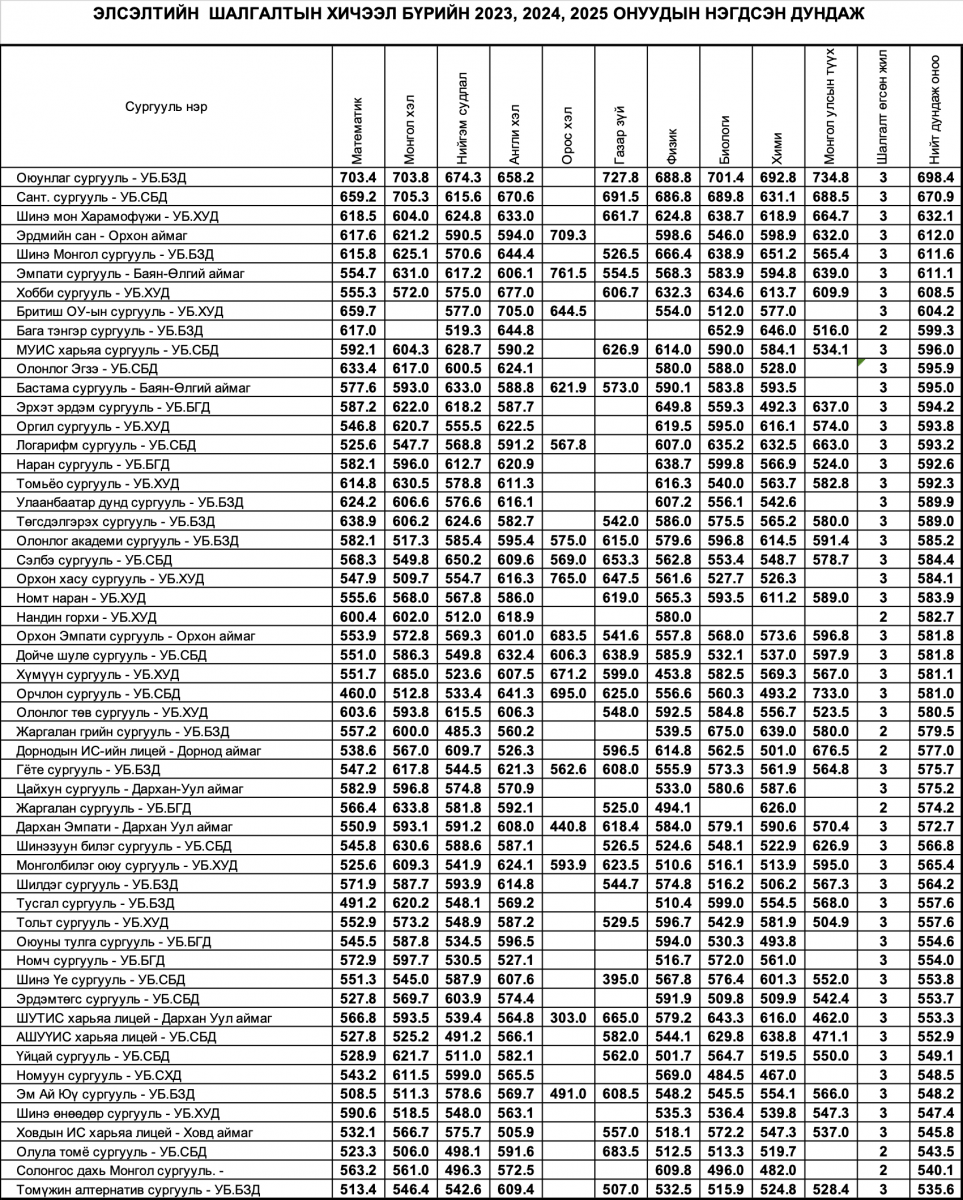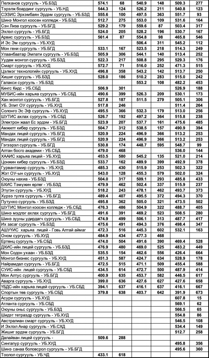Энэхүү мэдээлэл нь Боловсролын яам, БҮТ-өөс аймаг, нийслэл, дүүрэг болон сургууль тус бүрд илгээгдсэн шалгалтын үндсэн мэдээлэлд тулгуурлан, ерөнхий дундаж онооны үзүүлэлтээр тооцон, харуулсан үр дүн, эрэмбийн үзүүлэлт болохыг сануулъя.