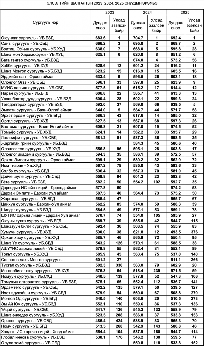 Хүснэгт 1: Элсэлтийн ерөнхий шалгалтын 2023, 2024, 2025 оны эрэмбэ