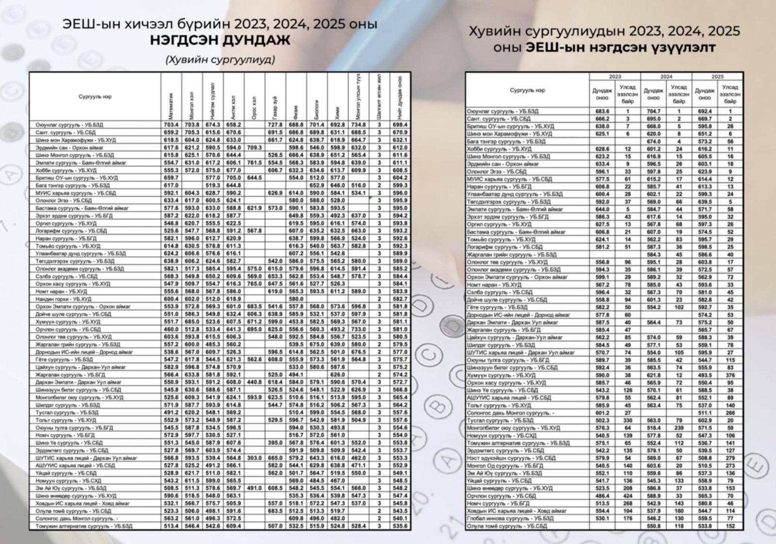 Энэхүү мэдээлэл нь сүүлийн гурван жилийн буюу 2023, 2024, 2025 оны ЭЕШ-ын үр дүнг харьцуулсан үр дүнгийн үзүүлэлт бөгөөд сурталчилгаанаас илүү баримтад итгэх нь хүүхдийн ирээдүйд хийж буй хамгийн ухаалаг шийдвэр гэдгийг эцэг, эхчүүдэд нээлттэй мэдээлж, таниулах зорилгын үүднээс нийтэлж байгаа эмхэтгэл болно.