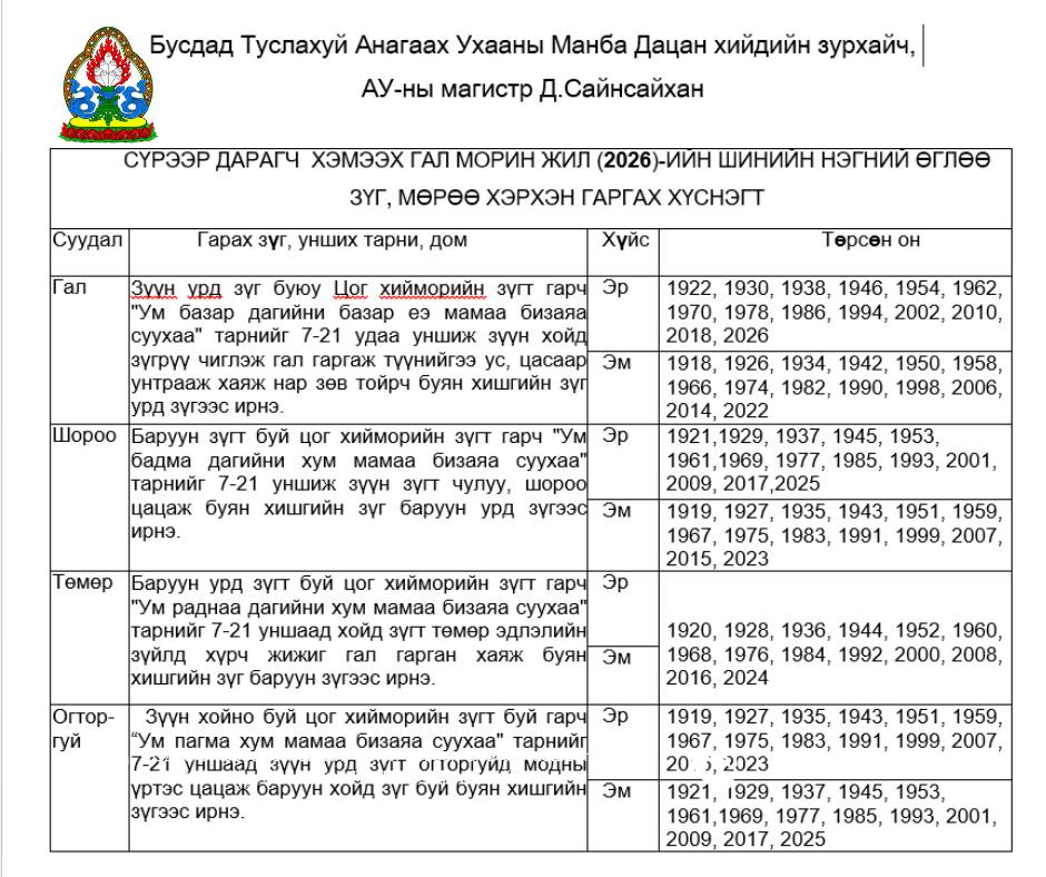 Бусдад Туслахуй Анагаах Ухааны Манба Дацан хийдийн зурхайч, Анагаах ухааны магистр Д.Сайнсайханы бэлтгэсэн Сүрээр дарагч хэмээх Гал морин жилийн шинийн нэгний өглөө зүг, мөрөө гаргах хүснэгтийг хүргэж байна.