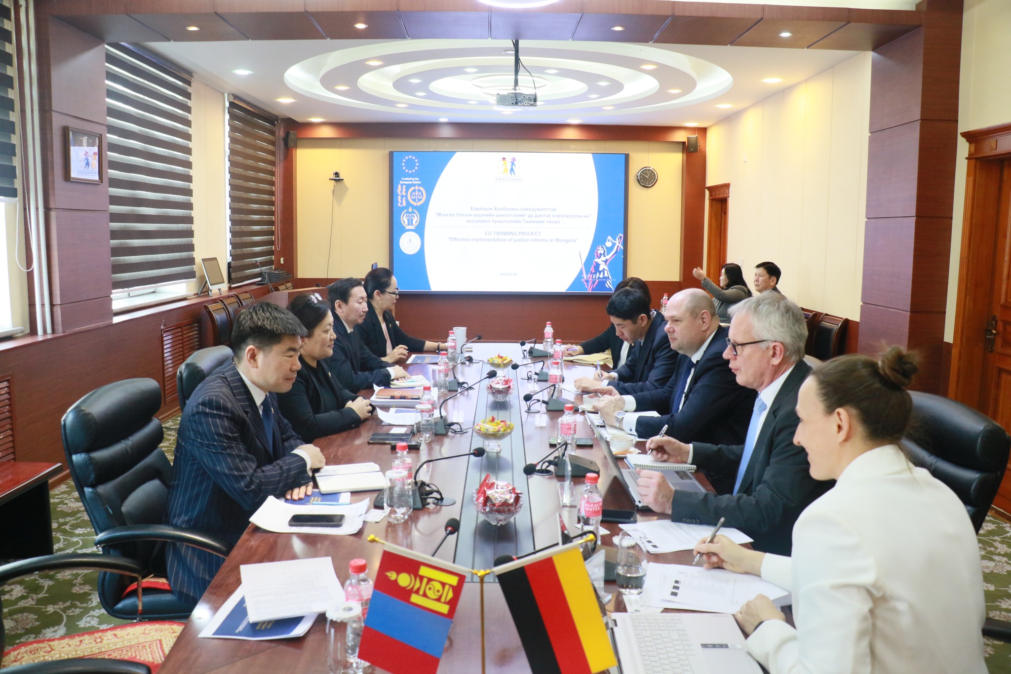 “Твиннинг” төслийн богино хугацааны зөвлөхүүд Холбооны Бүгд Найрамдах Герман Улсын шүүхийн захиргааны ажилтны сургалтын талаар танилцуулга хийж, практикт суурилсан богино хугацааны мэргэшүүлэх сургалтын модуль боловсруулах ажлын явц, гарын авлагын боловсруулалтын талаар мэдээлэл өглөө.