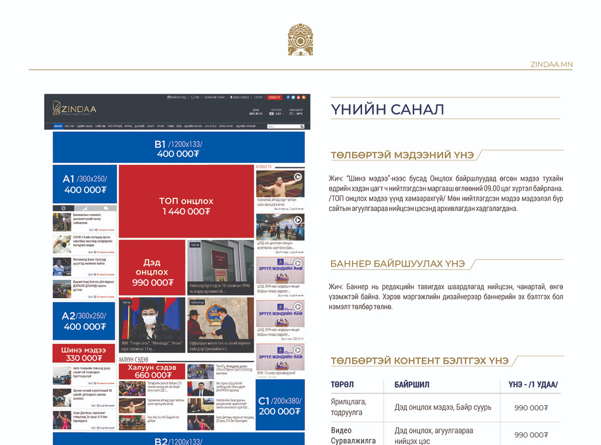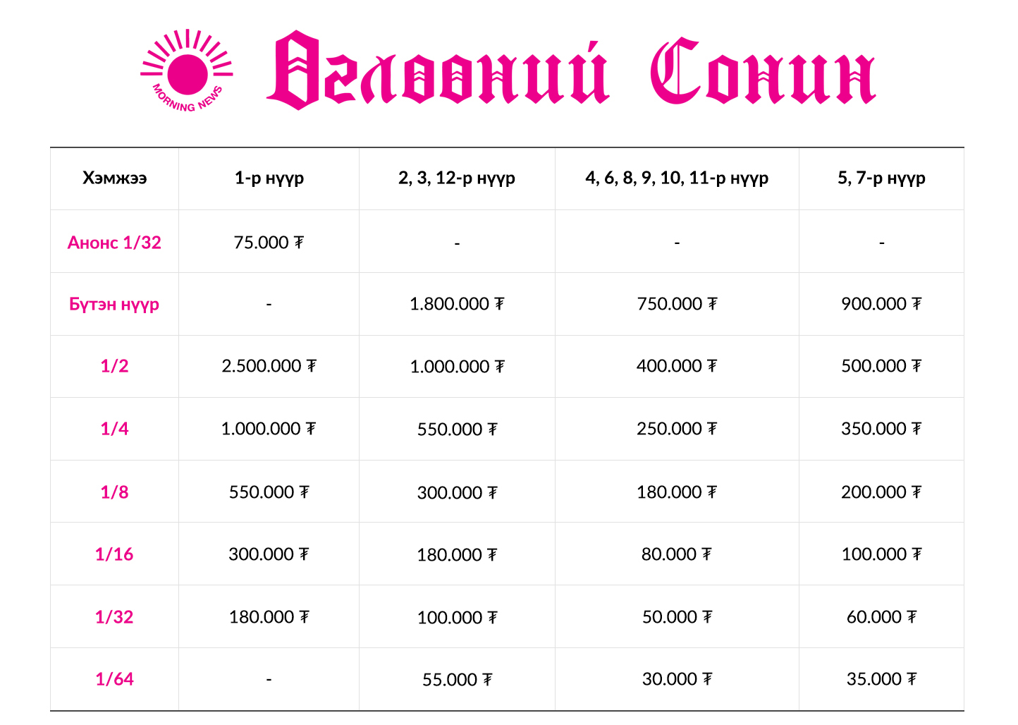 Жич: Улс төрийн агуулгатай болон шууд бус сурталчилгааны материалд доорх үнэ хамаарахгүй.